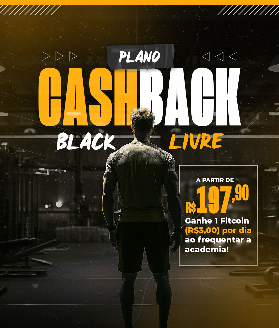 Com o Plano Cash Back Black Livre, cada visita à academia não só contribui para o seu bem-estar físico e mental, mas também lhe rende 1 Fitcoin por dia frequentado. Essa moeda virtual acumulada pode ser utilizada dentro do nosso ecossistema de recompensas, trazendo ainda mais valor à sua jornada de fitness.