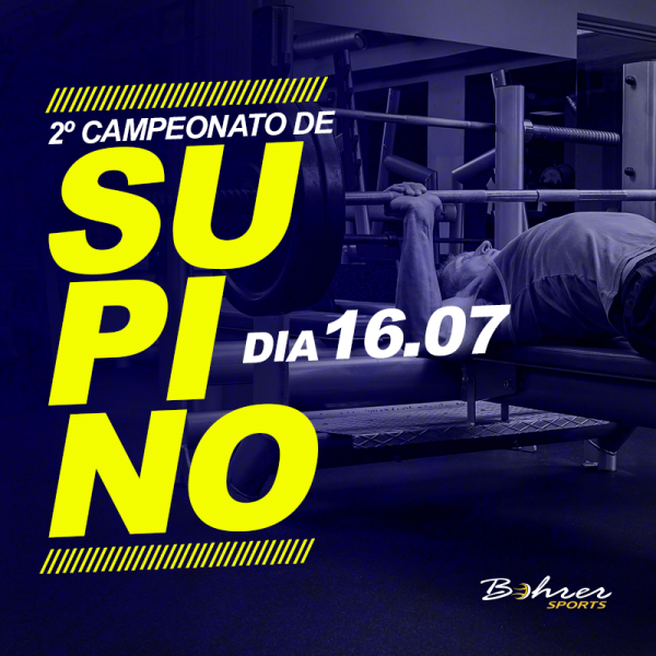 Nesta segunda-feira, dia 16.07, irá acontecer na Bohrer Sports o 2º Campeonato de Supino para alunos com mais de 18 anos do sexo masculino. O campeonato consiste em levantar a maior quantidade de peso possível, em um movimento completo do SUPINO, respeitando as regras e os colegas de competição. O aumento das cargas para o SUPINO se dará gradativamente em 05(cinco)Kg a 30(trinta)Kg.